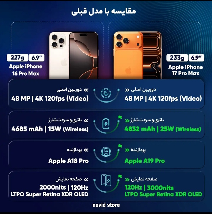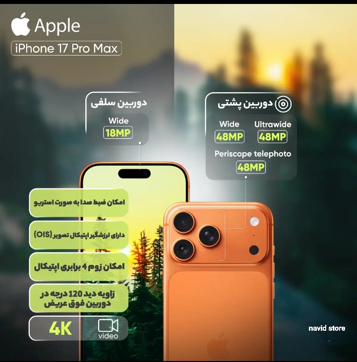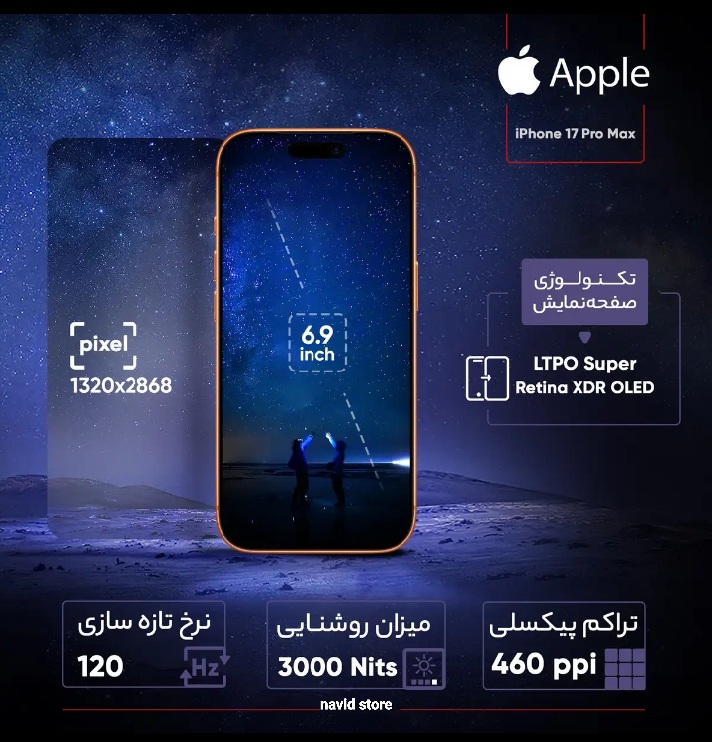 آیفون 17 پرومکس جدیدترین پرچم دار اپل است که باترکیب طراحی نوآورانه،قدرت سخت افزاری و قابلیت های نرم افزاری پیشرفته،استاندارهای تازه ای را دربازار گوشی های هوشمند تعریف میکند.بدنه این دستگاه از آلومینیوم فورج شده ساخته شده که علاوه برسبکی ،انتقال حرارت بهتری نسبت به نسل قبل دارد وهمراه با پوشش مقاوم Ceramic Shield نسل دوم،استحکام وظاهری مدرن را به همراه آورده است.قلب تپنده این گوشی تراشه قدرتمند A19 Pro با معماری سه نانومتری است که درکنار سیستم خنک کنندهVapor chamber و رم 12 گیگابایتی،عملکردی سریع و پایدار حتی درپردازش های سنگین تضمین می کند.